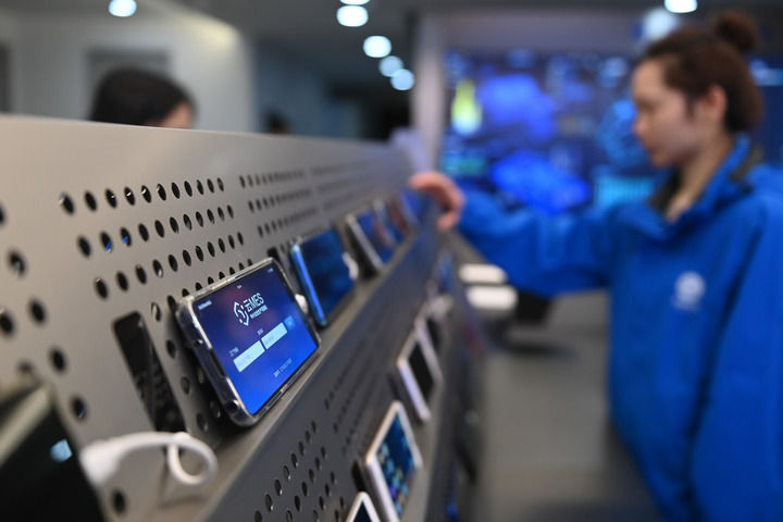 在位于杭州的蒲惠智造的办公区,展台摆放着手机等设备进行系统兼容性测试(2024年3月18日摄)。新华社记者 黄宗治 摄