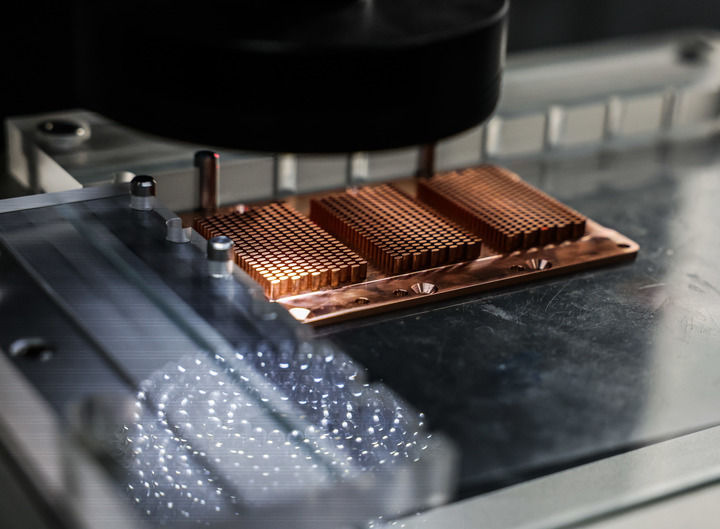 2024年4月16日,在位于诸暨市的海特信科新材料科技有限公司检测实验室内,工作人员在检测用于新能源汽车的针式散热铜基板。新华社记者 徐昱 摄