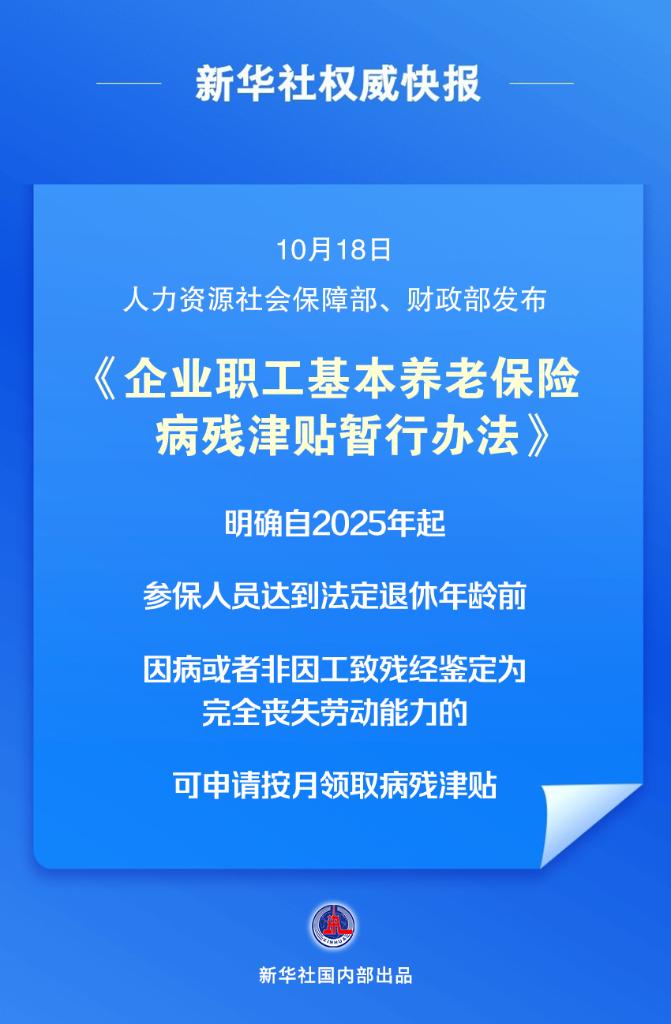 新华社北京10月18日电(记者姜琳)人力资源社会保障部、财政部18日发布《企业职工基本养老保险病残津贴暂行办法》。办法明确,自2025年1月1日起,企业职工基本养老保险参保人员达到法定退休年龄前,因病或者非因工致残经鉴定为完全丧失劳动能力的,可以申请按月领取病残津贴。