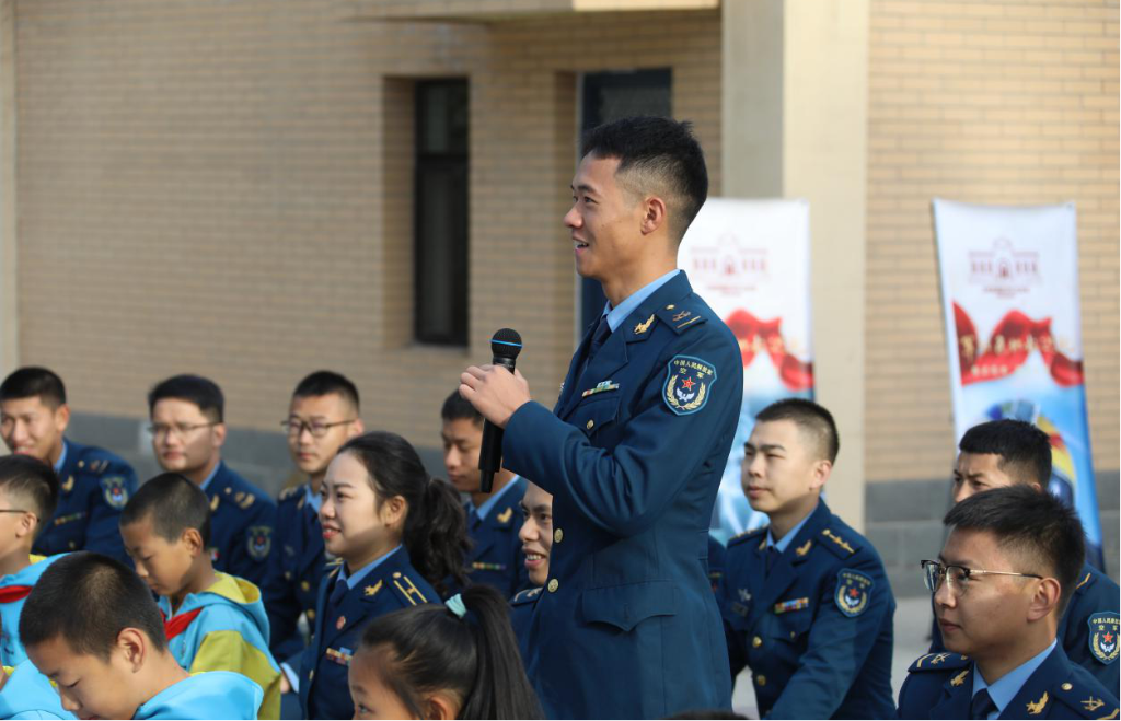 活动现场,官兵代表与驻地师生在纪念馆门前海报墙上签名、打卡红色地标,并在红色讲解员王政芳的引导下参观展馆,了解空军历史、追寻红色根脉。在空军新疆航空队成员使用的学习书籍展柜旁,王政芳讲述他们如何克服文化水平低的困难学习飞行,引起现场观众的敬佩与称赞。