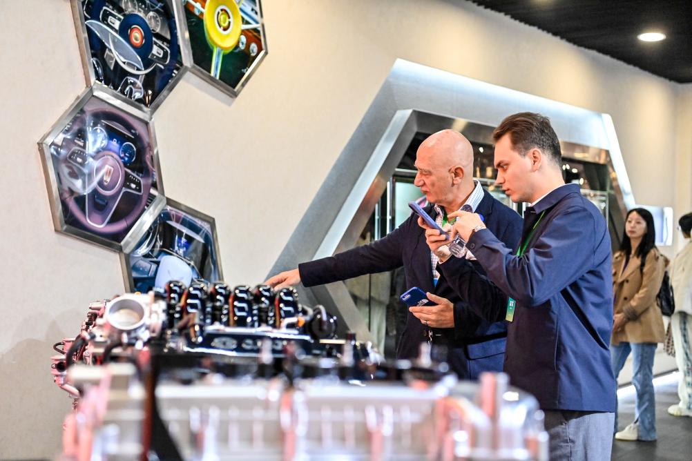 10月14日,外宾在吉林长春中国一汽红旗文化展馆参观。新华社记者 颜麟蕴 摄