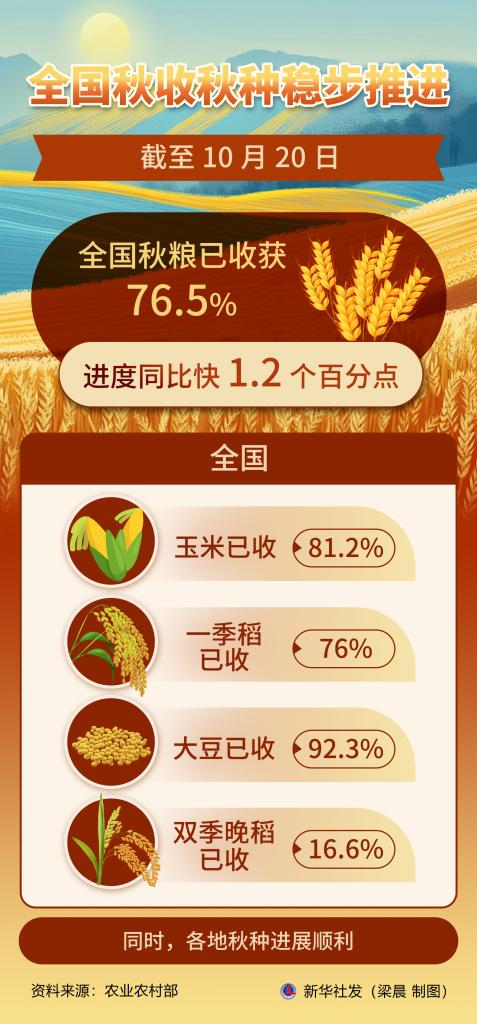 新华社北京10月21日电(记者于文静)目前,全国秋收秋种正稳步推进。截至10月20日,全国秋粮已收获76.5%,进度同比快1.2个百分点。