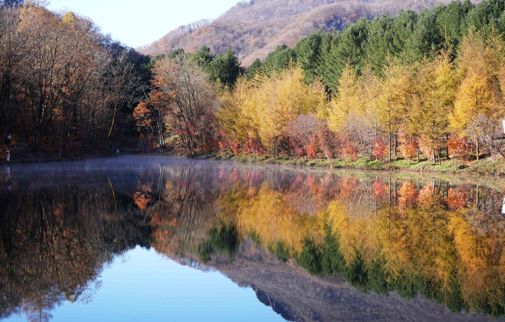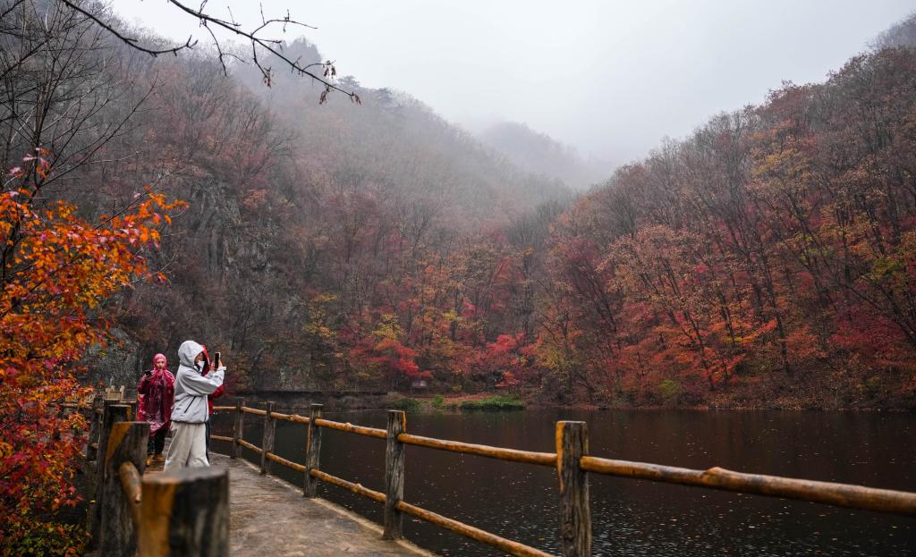 走进秋色正浓的本溪关门山国家森林公园,小雨淅淅沥沥,群山之间云雾缭绕,从山尖到山脚,几抹枫红若隐若现,颇有一番水墨韵味。