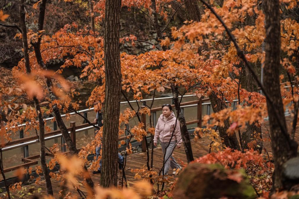 10月18日,游客在本溪关门山国家森林公园里游玩。新华社记者 潘昱龙 摄