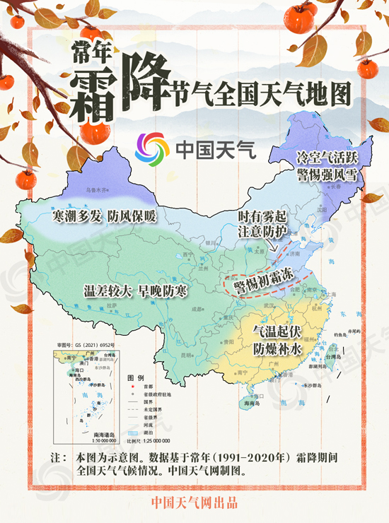 “霜降三旬后,蓂馀一叶秋。”常年霜降节气期间,影响我国的冷空气越来越频繁,多地天气由凉转寒,昼夜温差增大。随着气温走低,冬季的地盘也开始扩张,内蒙古、东北大部、山西、河北北部等地往往在霜降时节步入冬季,秋天最前沿会抵达江南南部地区。