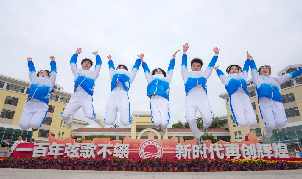 2024年10月21日,中国海洋大学崂山校区,几名学生在校庆背景板前合影。