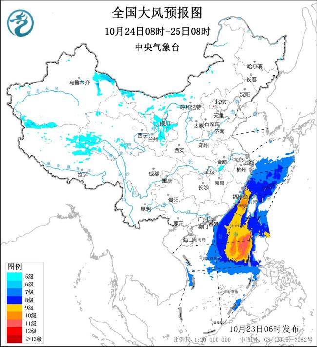 10月24日08时至25日08时,台湾海峡、巴士海峡、南海东北部和中东部海域将有9~10级、阵风11~12级的大风,其中南海东北部和中东部部分海域风力可达11级、阵风12~13级,东海南部海域、台湾以东洋面、南海西部和东南部海域将有8~9级、阵风10~11级的大风。