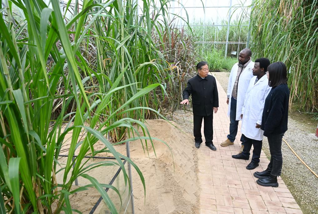 图为2021年11月23日,林占熺(左一)在国家菌草工程技术研究中心菌草种质资源圃给福建农林大学留学生(左二、左三)讲解菌草种植培育技术。新华社记者林善传 摄