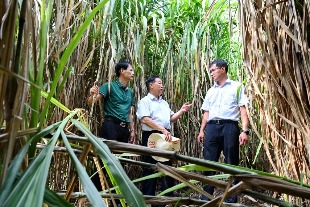图为2024年8月28日,林占熺(中)和菌草研究团队成员在福建省福州市永泰县查看菌草的生长情况。新华社记者林善传 摄