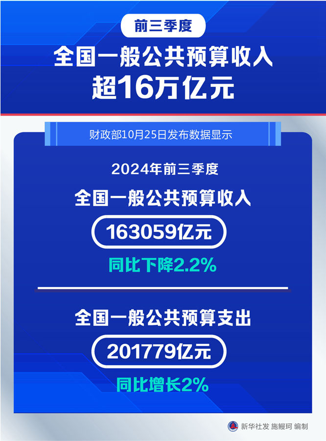 新华社北京10月25日电(记者申铖、胡旭)财政部25日发布数据显示,今年前三季度,全国一般公共预算收入163059亿元,同比下降2.2%。