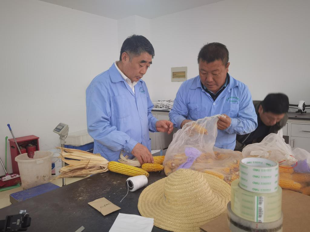 2023年,赵久然(左一)和团队骨干邢锦丰在工作间一起进行育种材料考种。(受访者供图)