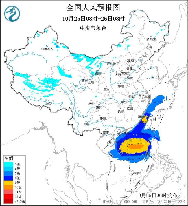 预计,10月25日08时至26日08时,东海西部海域、台湾海峡、南海北部和中部海域、巴士海峡、东沙群岛、中沙群岛、西沙群岛将有7~9级、阵风10~11级的大风,其中南海中东部的部分海域风力可达10级、阵风11~12级。