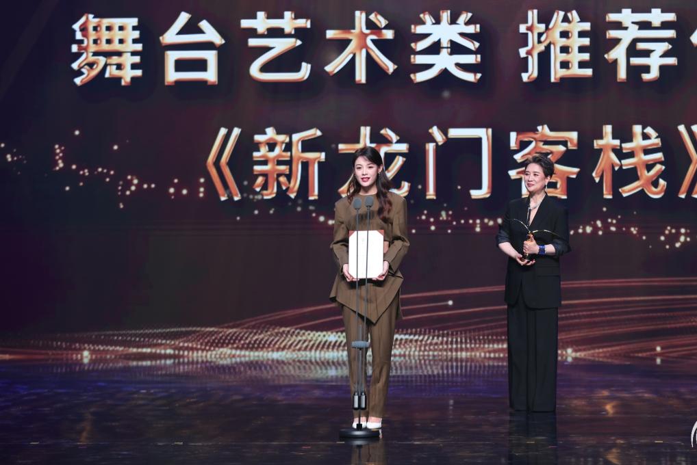 10月26日晚,越剧舞台纪录电影《新龙门客栈》艺术总监茅威涛和领衔主演陈丽君上台领奖。(主办方供图)