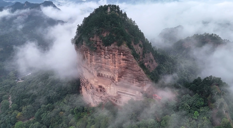 云雾笼罩中的麦积山。新华社发
