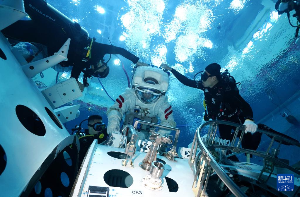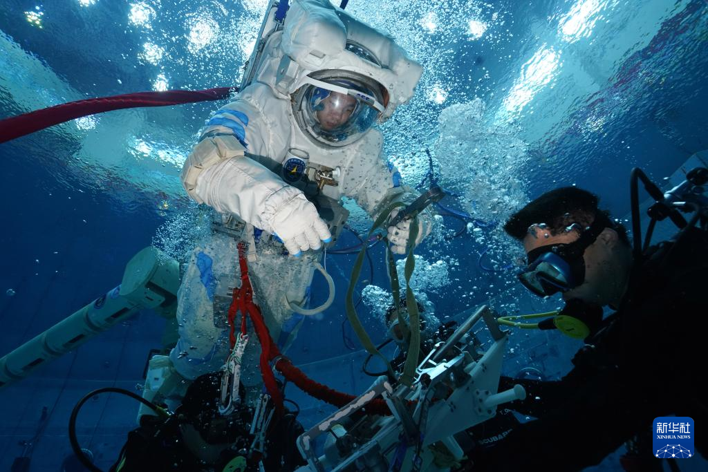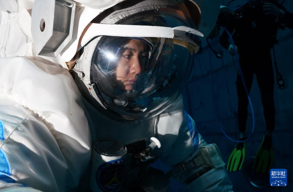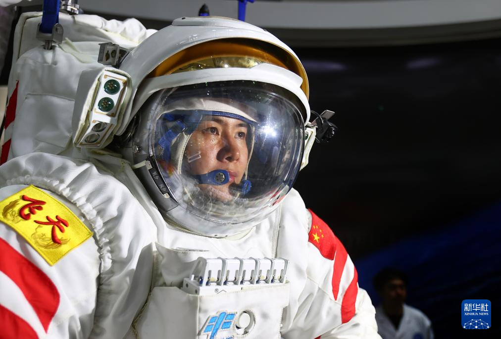 出舱程序训练中,航天员需要穿上100多公斤重的舱外航天服,模拟出舱过闸段动作。由于服装内加了0.4个大气压,王浩泽举手投足比较费力,加上在头盔内头部活动受限,视野也变得狭窄,只能借助腕部反光镜来扩大视野。