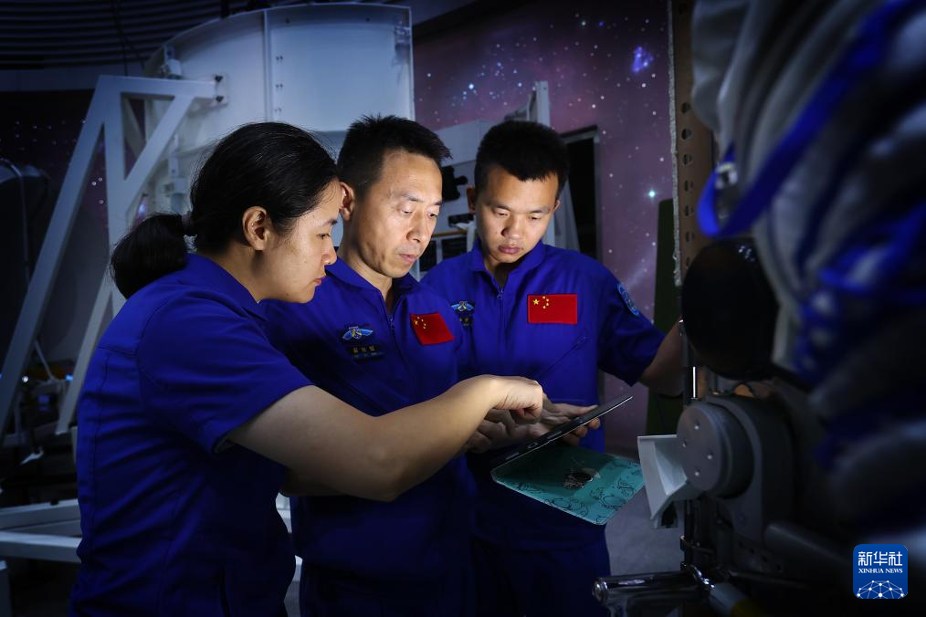 神舟十九号航天员乘组进行舱外航天服操作训练(2024年6月21日摄)。新华社发(徐部摄)