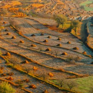 深秋时节的彭阳县,随处爬上一座山都能收获一幅如画美景:各种植被高低错落,层层叠叠铺满山间梯田,好似打翻了大自然的调色盘,泼出一层深绿、一层浅金、一层橙红,从高空俯瞰,就像一圈圈多彩缎带从山脚盘绕至山尖。