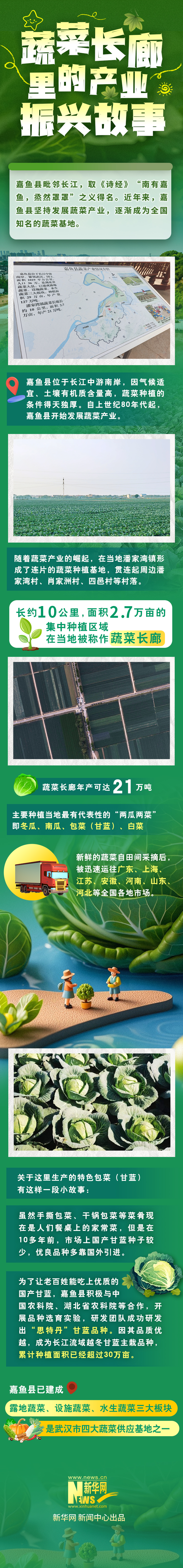湖北省嘉鱼县位于长江中游南岸,因气候适宜、土壤有机质含量高,蔬菜种植的条件得天独厚。随着蔬菜产业的崛起,在当地潘家湾镇形成了长约10公里,面积2.7万亩的蔬菜长廊。它是怎么形成的?都有哪些特色蔬菜?一起来看看吧!