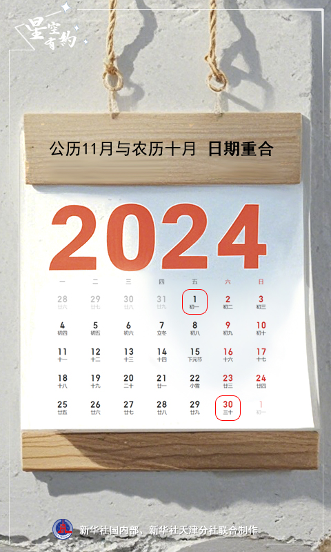 新华社天津11月7日电(记者 周润健)这几天,细心的公众在翻看日历时会发现,公历11月与农历十月的日期完美重合:公历11月1日这天是农历十月初一,公历11月30日这天是农历十月三十。这是怎么回事呢?听听天文科普专家怎么说。