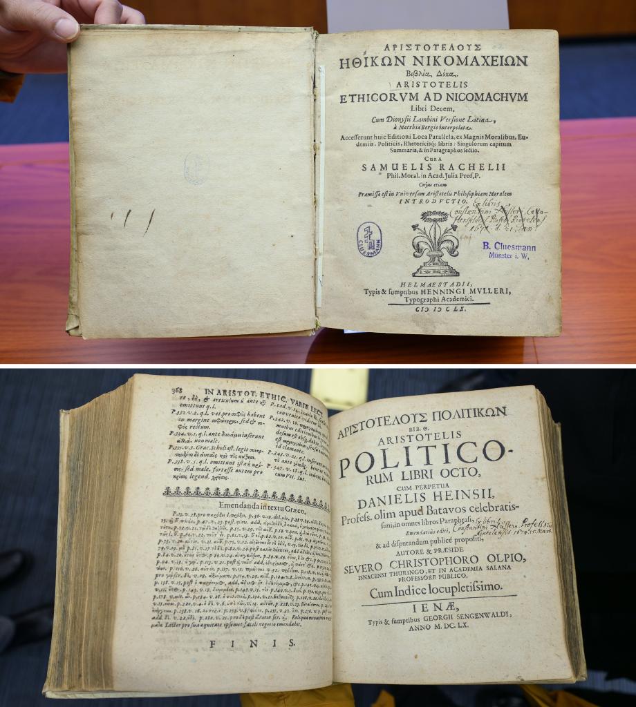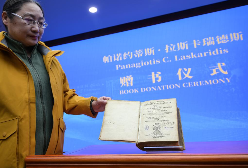 11月7日,在首届世界古典学大会期间,希腊埃卡特里尼·拉斯卡瑞德斯基金会向中国社会科学院赠送两部古典学研究古籍,分别为17世纪印刷的亚里士多德著作《尼各马可伦理学》和《政治学》。