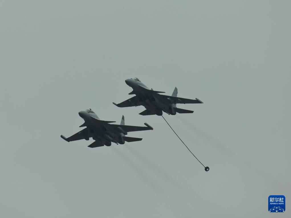 11月12日,海军歼-15系列舰载战斗机编队在第十五届中国航展上展示伙伴加油课目。新华社发(吕志浩摄)
