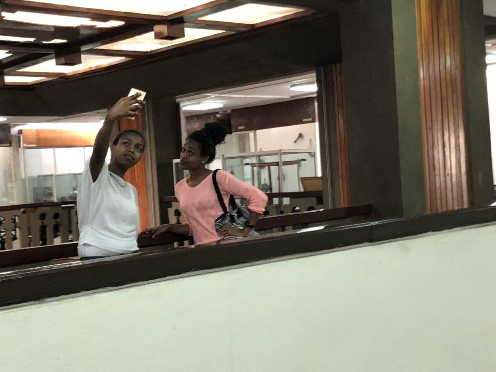 在埃塞俄比亚国家博物馆,两位女学生在拿着手机自拍。