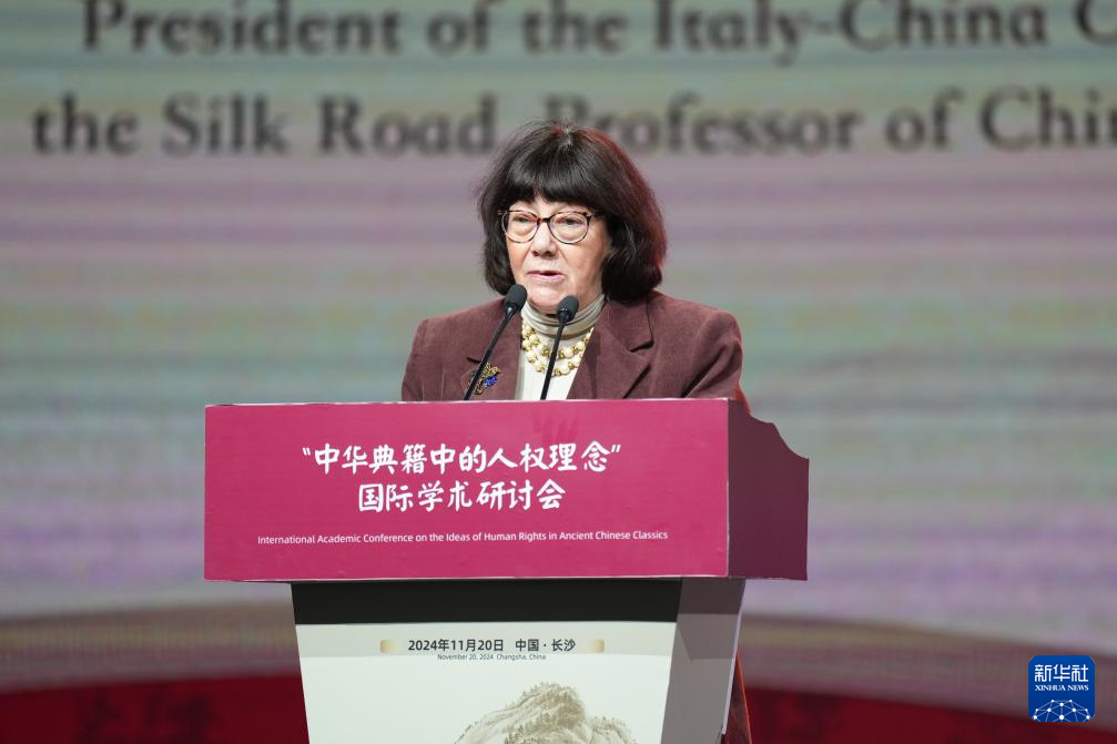 11月20日,意大利中国丝绸之路文化交流合作中心主席、米兰大学汉语及中国文化教授梅毕娜在“中华典籍中的人权理念”国际学术研讨会开幕式暨主论坛现场发言。新华社记者 薛宇舸 摄