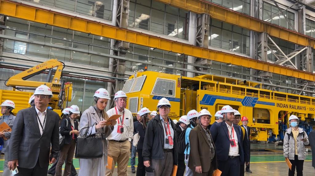 11月19日,外宾在中国铁建高新装备股份有限公司的国家铁路大型养路机械工程技术研究中心参观。新华社记者赵彩琳 摄