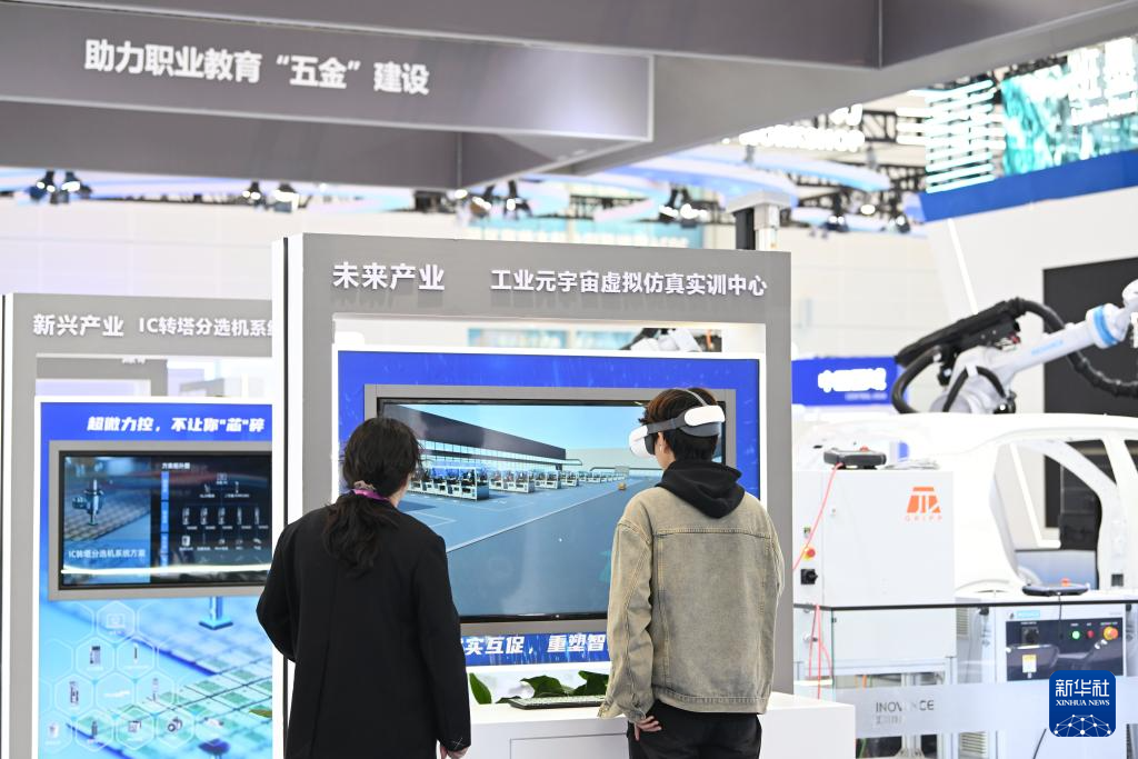 11月21日,参会者在职业教育专题展上体验未来产业仿真实训中心。当日,2024年世界职业技术教育发展大会在天津开幕,大会设有职业教育专题展,展览面积约5600平方米。展览设置了技能塑造人生、技艺传承文明、服务产业升级、国际交流合作、产教互融互通等7个板块,全方位展示职业教育改革发展成果。新华社记者 李然 摄