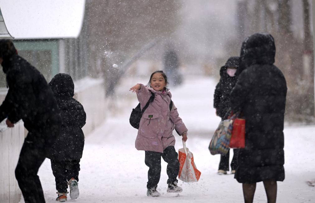11月24日,一名小朋友在雪中和同伴玩耍。新华社记者 张宏祥 摄