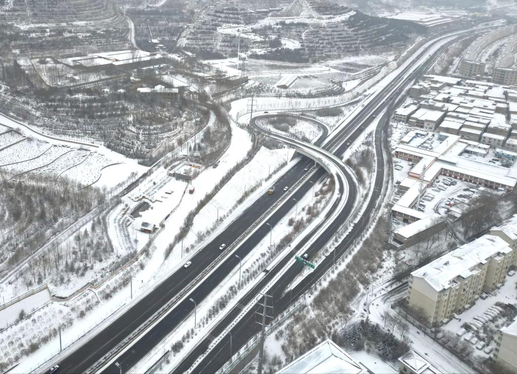 一场降雪后,高原古城西宁披上银装,这是连接城市的凤凰山路一角(无人机照片)。新华社记者李宁 摄