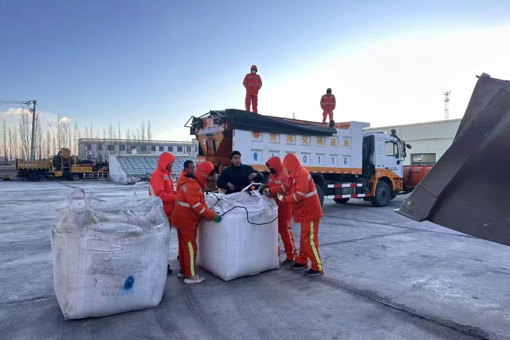 图为养护人员准备铺撒融雪剂。新华社发