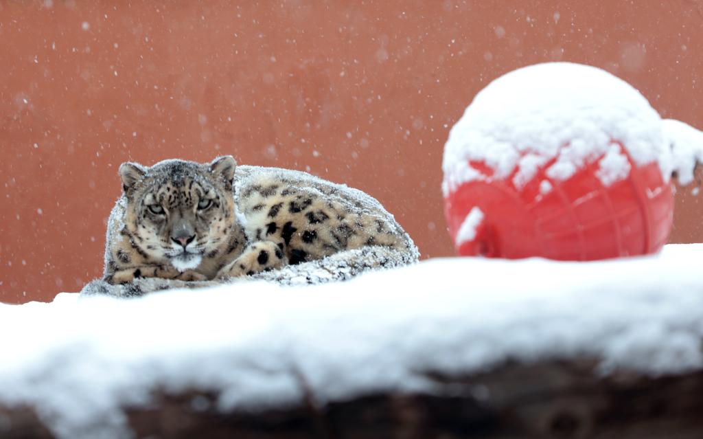 一场降雪后,西宁野生动物园豹馆,雪豹“凌霜”在覆盖着白雪的木板上休憩。新华社记者 李宁 摄