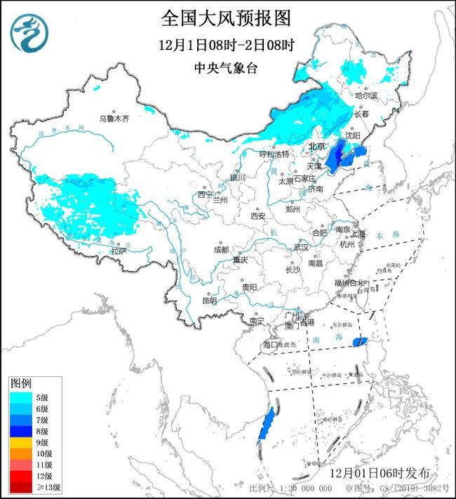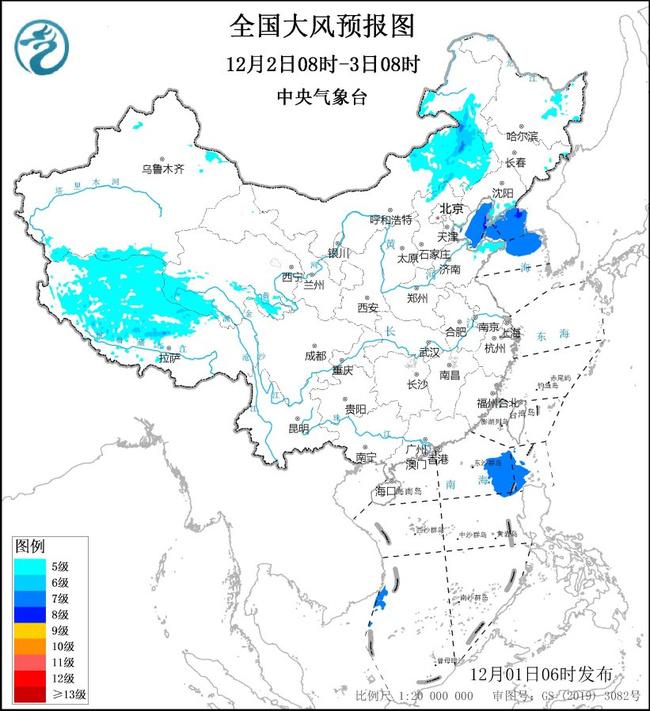 预计,12月1日08时至2日08时,西藏北部和西部、内蒙古中部、河北北部、黑龙江西部、吉林西部、辽宁西部等地将有5~6级、阵风7~8级的大风;渤海、渤海海峡、黄海北部偏北海域将有7~8级、阵风9级的大风。