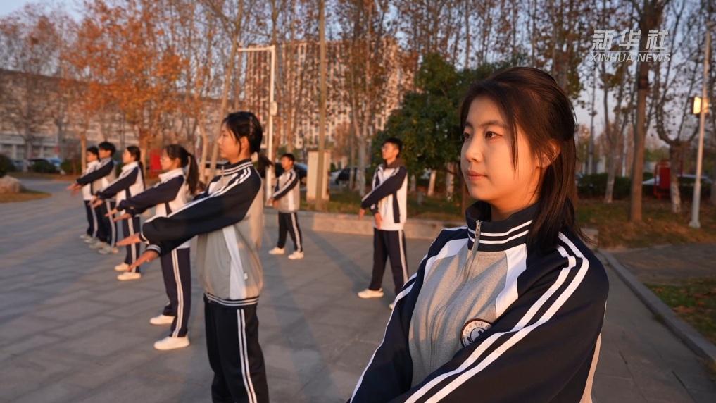 寒冬季节,在河南中医药大学校园一处空地,梅永震功法养生工作室的学生们正在习练八段锦。