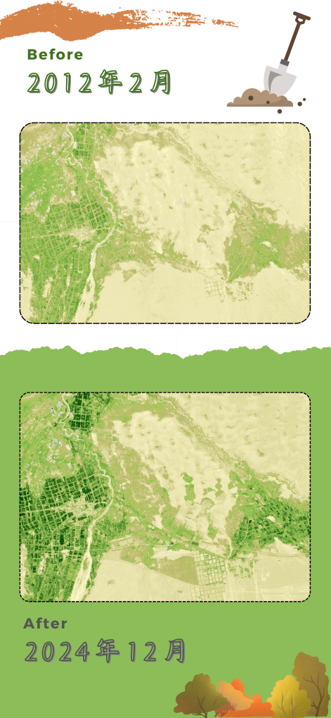 2012年至2024年,于田县城到奥依托格拉克乡区域内的卫星遥感归一化植被指数(NDVI)对比。绿色越深,表示该区域绿植密度越大。十余年间,该区域绿植密度明显提升。