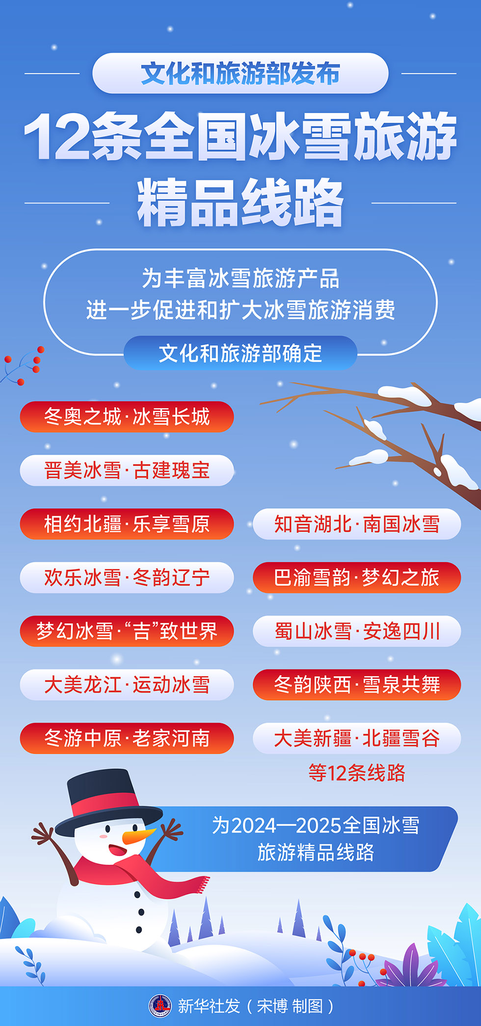 近日,文化和旅游部发布了12条全国冰雪旅游精品线路,确定“冬奥之城·冰雪长城”“晋美冰雪·古建瑰宝”“相约北疆·乐享雪原”“欢乐冰雪·冬韵辽宁”“梦幻冰雪·‘吉’致世界”“大美龙江·运动冰雪”“冬游中原·老家河南”“知音湖北·南国冰雪”“巴渝雪韵·梦幻之旅”“蜀山冰雪·安逸四川”“冬韵陕西·雪泉共舞”“大美新疆·北疆雪谷”等线路为2024—2025全国冰雪旅游精品线路。各条旅游线路上的特色冰雪活动和沿线可游览的景区精彩纷呈,你想好去哪儿玩了吗?