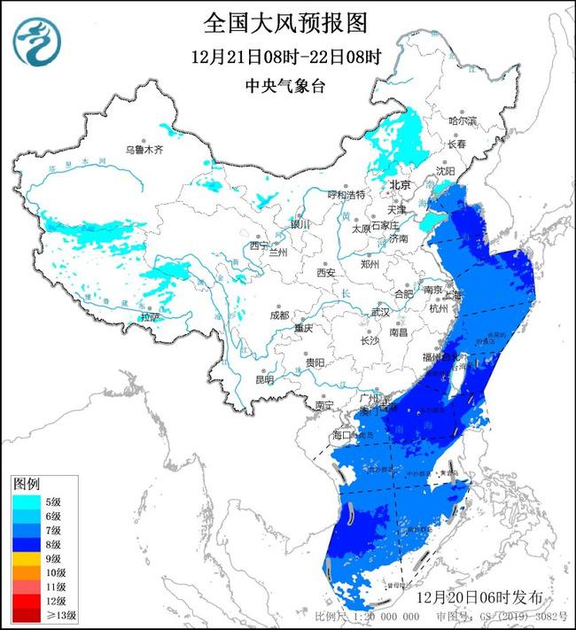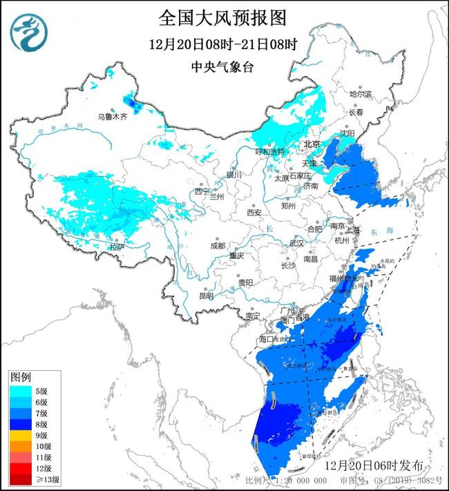 预计,12月20日08时至21日08时,西藏中北部、青海南部、甘肃西部、内蒙古中部、辽东半岛、河北沿海地区、天津沿海地区、山东半岛等地部分地区将有5~6级、阵风7~8级的大风;渤海、渤海海峡、黄海大部海域、东海南部海域、台湾海峡、台湾以东洋面、南海大部海域将有7~8级、阵风9级的大风。