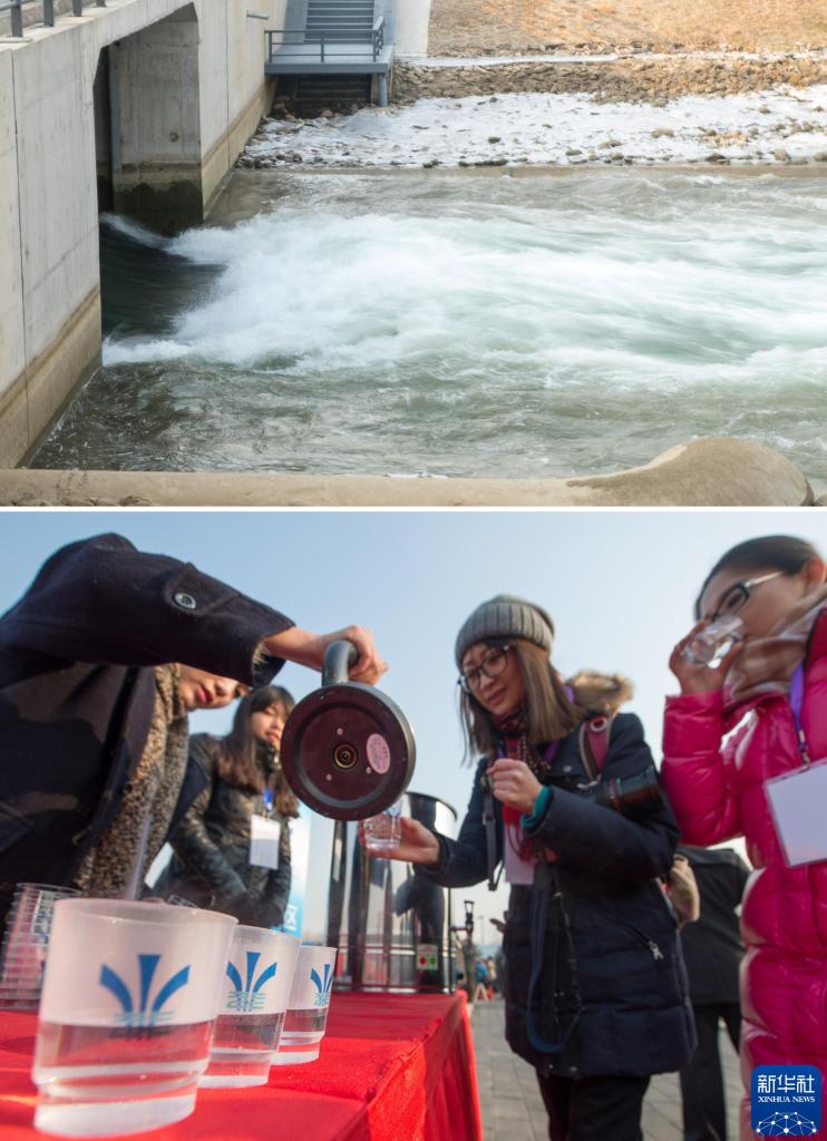 拼版照片:2014年12月27日,南水北调中线一期工程总干渠终点团城湖明渠开闸放水(上图);参加通水仪式的嘉宾在仪式现场品尝来自丹江口的水(下图)。当日,南水北调中线一期工程总干渠终点团城湖明渠开闸放水,北京市南水北调工程正式通水。新华社记者 张宇 摄