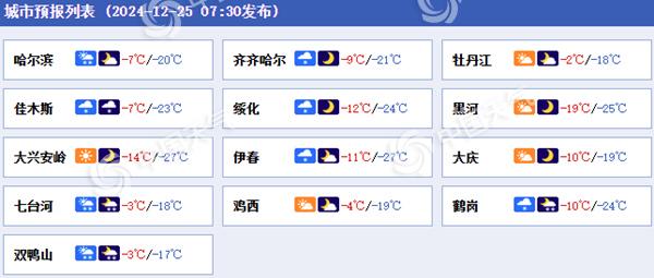 今明两天(12月25日至26日),黑龙江将现风雪、降温天气,自西向东有小雪,局地阵风可达8级,哈尔滨今夜最低气温将降至-20℃,公众请注意防寒保暖,防范道路积雪和风吹雪对交通出行等方面的不利影响。