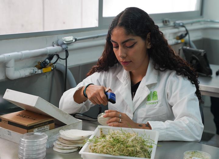 2022年11月7日,一位研究人员在墨西哥特斯科科郊外国际玉米小麦改良中心做实验。新华社记者 朱雨博 摄