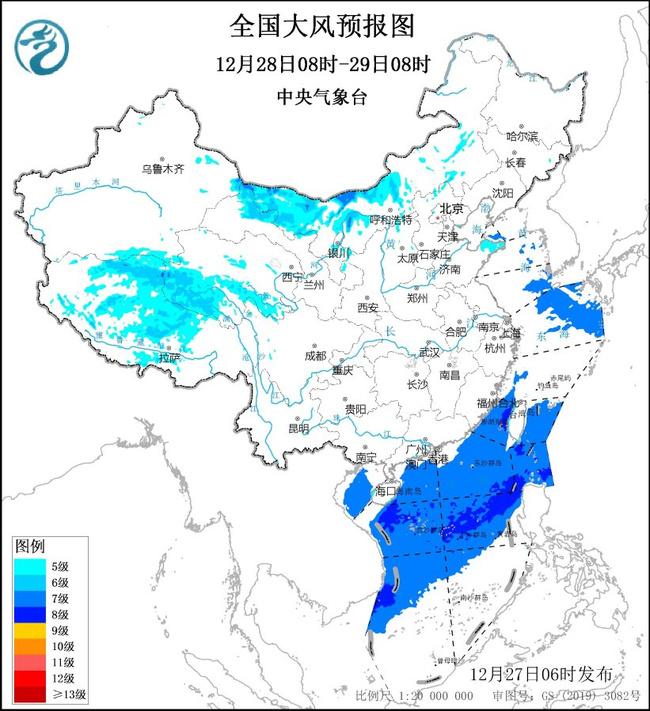 12月28日08时至29日08时,内蒙古中西部、新疆东部、甘肃西部、宁夏、河北北部、青海南部、西藏中北部等地部分地区有5~6级风、阵风7~8级;黄海南部海域、东海北部海域、台湾海峡、台湾以东洋面、巴士海峡、南海大部海域、北部湾将有7~8级、阵风9~10级的大风。