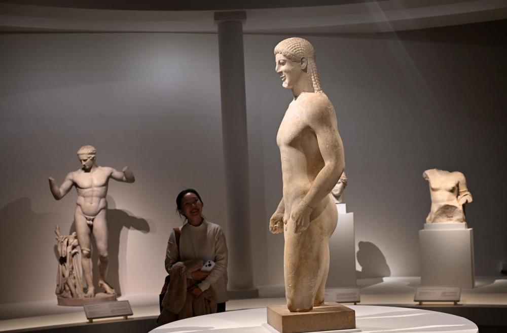 11月5日,观众参观“美的多元——古希腊的艺术与生活”展览展出的大理石库罗斯雕像。新华社记者 金良快 摄
