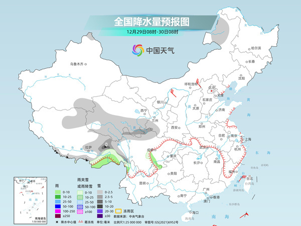 昨天,我国降水主要出现在西藏地区,西藏西部部分地区出现小雪,局地中雪。