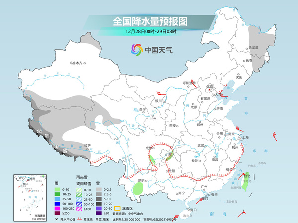 中央气象台预计,今天,黑龙江中东部、吉林东部、新疆北疆北部和南疆盆地、青海西部、西藏西部和南部等地部分地区有小雪或雨夹雪,其中,西藏西部和南部等地部分地区有中到大雪,局地暴雪。四川盆地西南部、云南中部、台湾岛大部等地部分地区有小雨。