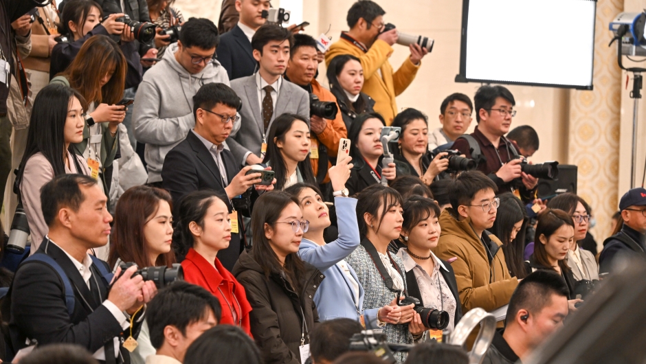 生态环境部部长黄润秋向记者挥手致意