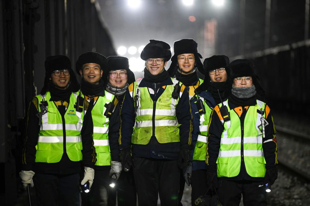 地处毛乌素沙漠边缘的浩吉铁路靖边东站位于陕西省靖边县,是运煤列车南下经过的第一个列检作业场,平均每天有85列运煤列车在此停靠检修。1月10日,检车员赵旭文、李龙、刘云飞、郭晓林、苏一杭、高曦晨、曹旭(从左至右)在作业股道合影。(新华社记者 张博文 摄)