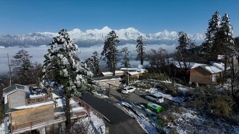 大雪过后,景区遍布触手可及的晶莹雾凇,与远处雄伟壮丽的雪山遥相呼应,共同构成了一幅美丽的冰雪世界画卷。