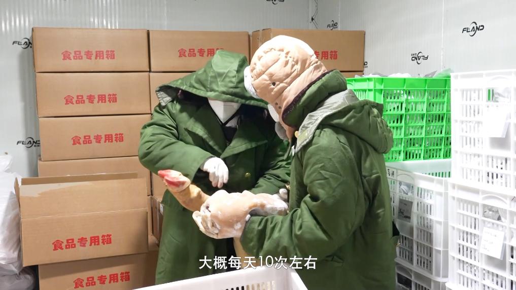 在四川铭富鲜食品有限公司,工人们正在对新鲜牛肉进行分割加工,分割好的牛肉有的直接被送往市场销售,有的则被放入冻库里速冻保鲜。四川铭富鲜食品有限公司工人汪敏介绍说,进冻库需穿专门的服装,“每天进冻库大概10次左右,有时时间会长一点,但是每10分钟过后都会出来一次,等身体暖和一点再进去。”