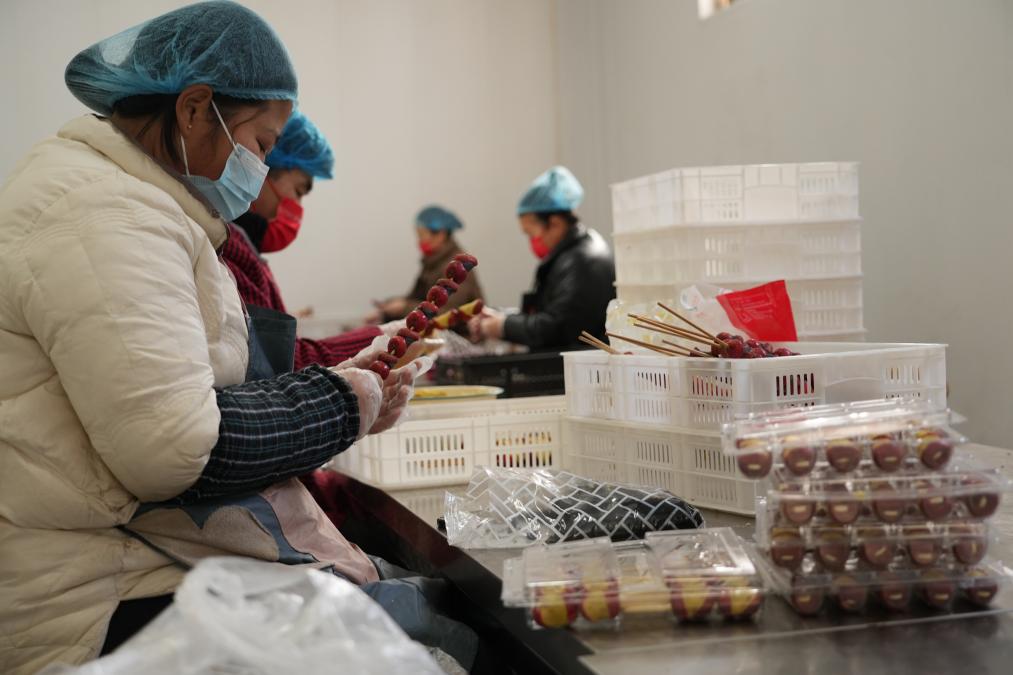 走进河北益农园食品有限公司的加工车间,多位村民正忙着给山楂添加馅料。在这里,筛选、分类和清洗果仁原料时使用机械化设备,去核、穿串等核心环节保留传统人工手艺。“手快的人,每天可以穿数百串,每天收入能达到三四百元。”村民王艳琴说,工厂里有100多名员工,大多是30到50岁的妇女。大家不耽误照顾老人孩子,在村里工厂就能打工就业,获得收入。
